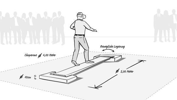 Das war uns aber nicht genug. Deshalb haben wir das virtuelle Erlebnis durch ein haptisches ergänzt: Die Planke, über die die Besucher gehen mussten, um das Zepter zu erreichen, war eine echte, beweglich gelagerte Holzplanke. Die Kombination aus virtueller Höhe und wackligem Untergrund hat die Immersion extrem verstärkt.