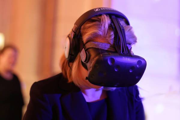 Virtuelle Realität ist – gerade bei den ersten Malen – eine beeindruckende Erfahrung. Man nimmt sie als echt wahr, nichts anderes meint Immersion. Als Hardware haben wir die HTC Vive mit Kopfhörern verwendet. Sie bietet eine Auflösung von 1080 x 1200 Pixeln pro Auge, einen Gyrosensor, einen Beschleunigungsmesser und einen Laser-Positionsmesser. So kann man sich frei im Raum bewegen.